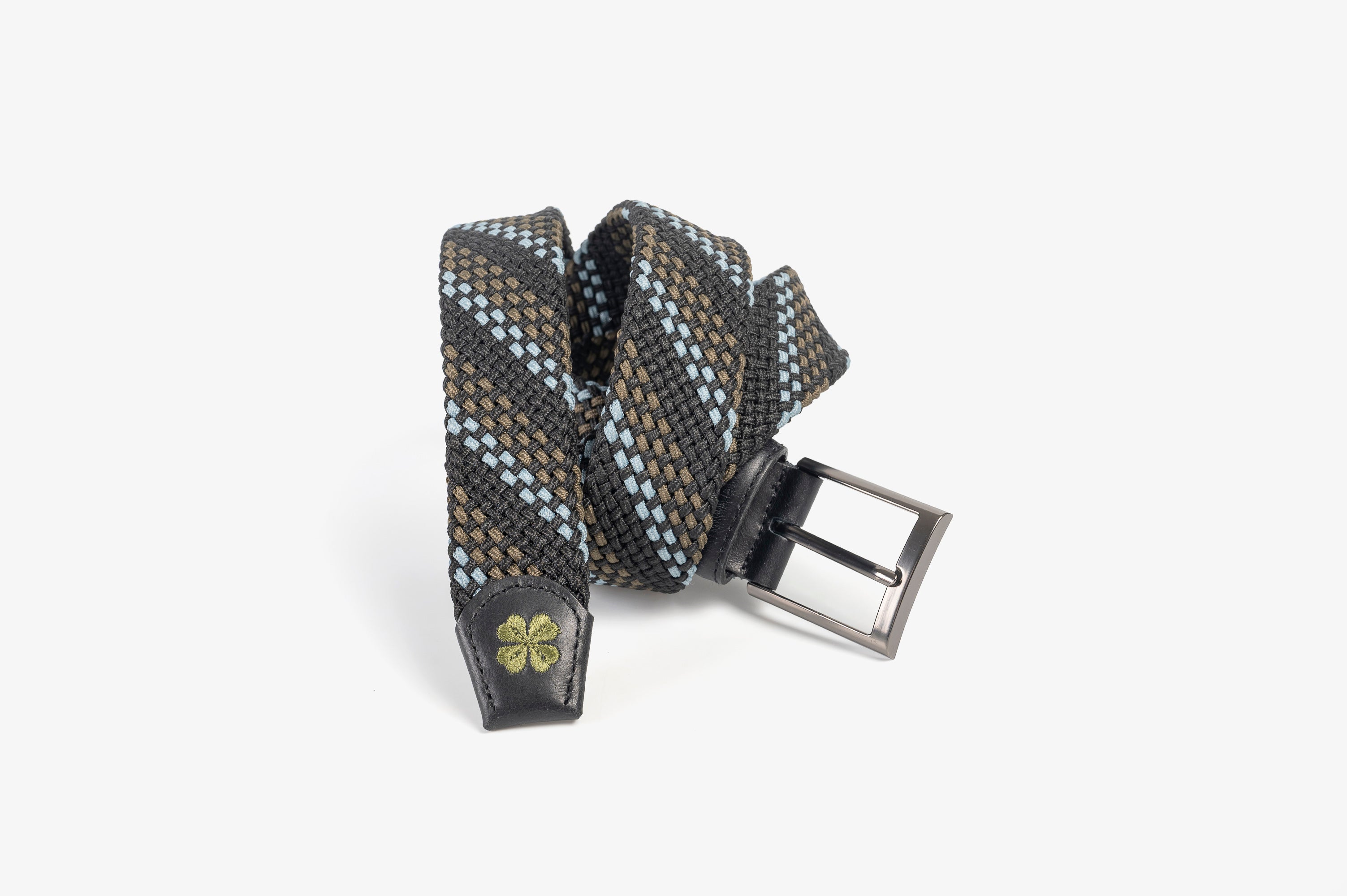 Discover the distinctive character of The Lucky Belt, featuring a rare tubular braid that brings depth and flexibility to its form. The black and olive-green diagonal pattern creates a striking yet refined contrast—modern on the fairway, polished beyond it. Finished with a four-leaf clover embroidered on the leather tip, it stands as a subtle reminder that fortune favors the prepared. A belt crafted for men who find their edge in the details.