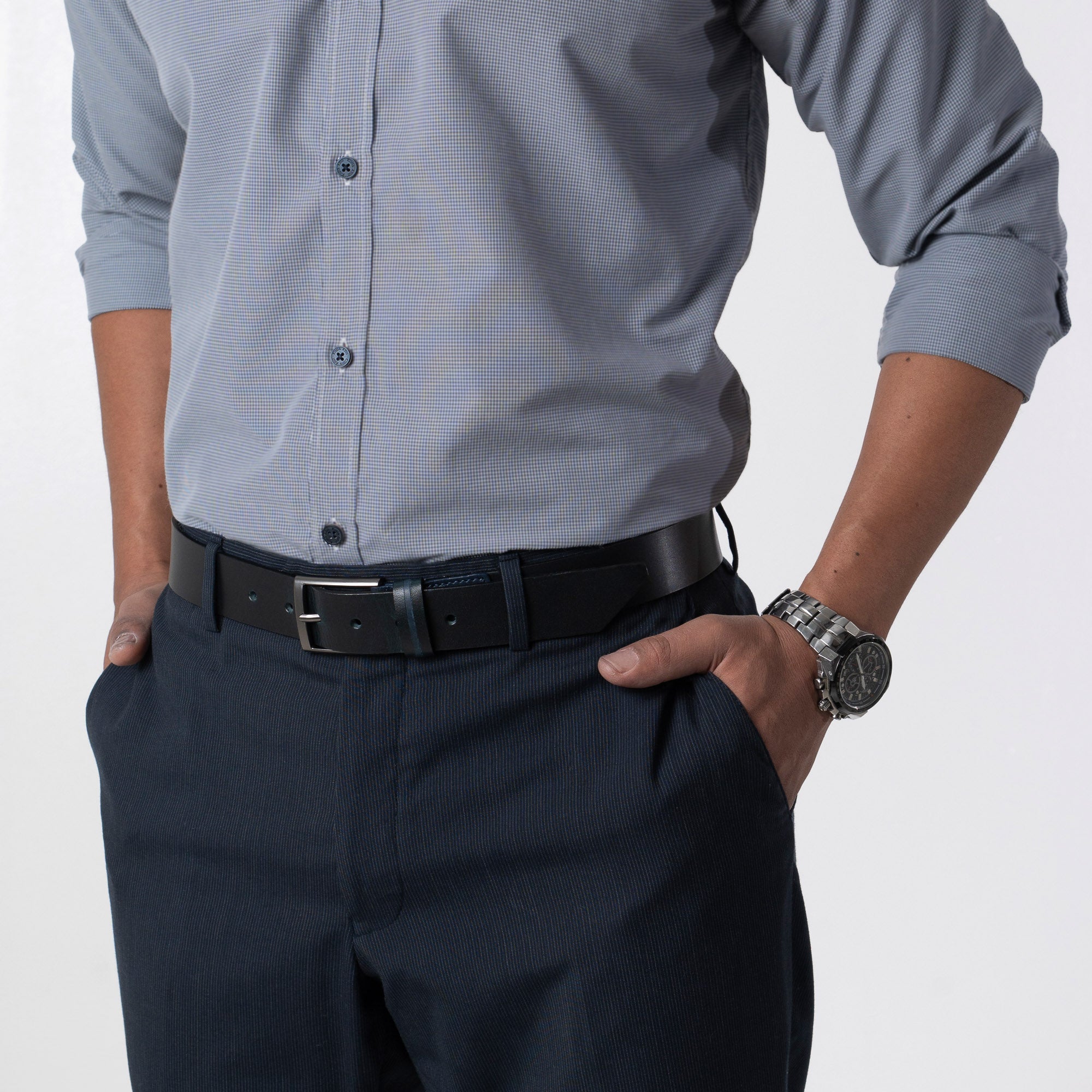 Sleek, sophisticated, and versatile, this black leather belt is crafted from premium smooth leather with a refined matte finish. The polished gunmetal buckle adds a modern touch, making it the perfect companion for both formal and casual occasions.